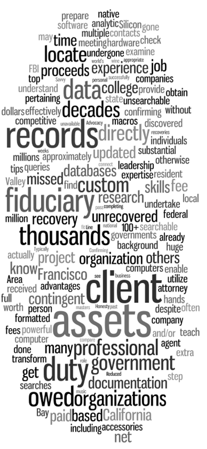 "In my role as Senior Counsel in the Office of the General Counsel for The Regents of the University of California, one of the best decisions I recently made was to hire Christopher Blunden to conduct an in depth search for assets that might belong to the University of California. Mr. Blunden performed well beyond my expectations by recovering more than four hundred thousand dollars for the University. [Update: Recoveries now exceeding $8 Million] His eclectic skills and research methods salvaged literally thousands of disbursements owed to our campuses and medical centers that others hired for the same purpose completely missed. I strongly recommend Mr. Blunden for any asset searches you might need. Since his 10% fee is a contingent fee, my office was able to hire him without any financial risk. In sum, this was a prudent decision which provided significant positive fiscal results for the University."